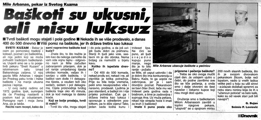 Tada „privatnik“ nije smio proizvoditi proizvod teži od 250g tijesta, ali to je bilo premalo za kruh. Tako je nastala jedina Pekara bez kruha u Hrvatskoj čija je osnovna djelatnost bila i ostala proizvodnja BAŠKOTA.