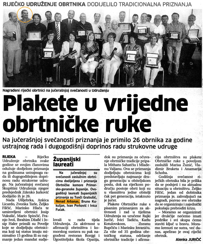 Da je obrt tradicijsko obiteljski u kojem danas radimo moj brat, sestra i ja prepoznao je i Zavod za poslovna istraživanja te mu je 2001. godine dodijelio priznanje za 34 godine rada uvrstivši ga u prvih 17% po opsegu posla i prvih 2% po tradiciji, a 2010. godine Obrtnička komora Primorsko-goranske županije dodijelila mu je Povelju za posebne uspjehe u unapređivanju i razvoju obrtništva. Sustav HACCP uveden je 2005. godine.